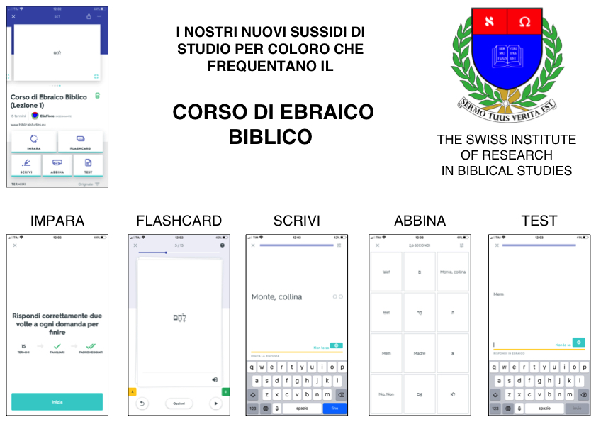 E’ con estremo piacere che The Swiss Institute of Research in Biblical Studies annuncia checoloro che sono iscritti al Corso di Ebraico Biblico (I), possono ora usufruire di nuovi sussidi di studio interattivo tesi a supportare gli studenti nello studio e nella memorizzazione dei vocaboli trattati in classe, rendendo l’apprendimento di quanto viene spiegato in classe più intuitivo.